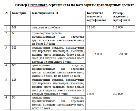 С 20 февраля 2019 года при сдаче вышедшего из эксплуатации транспортного средства (ВЭТС) владелец получает сертификат размером 550 и 750 тысяч тенге, в зависимости от категории ВЭТС, ранее размер сертификата за них составлял 450 тысяч и 650 тысяч тенге. Размер скидочного сертификата за сдачу старого легкового автомобиля на утилизацию остается прежним - 315 тысяч тенге.